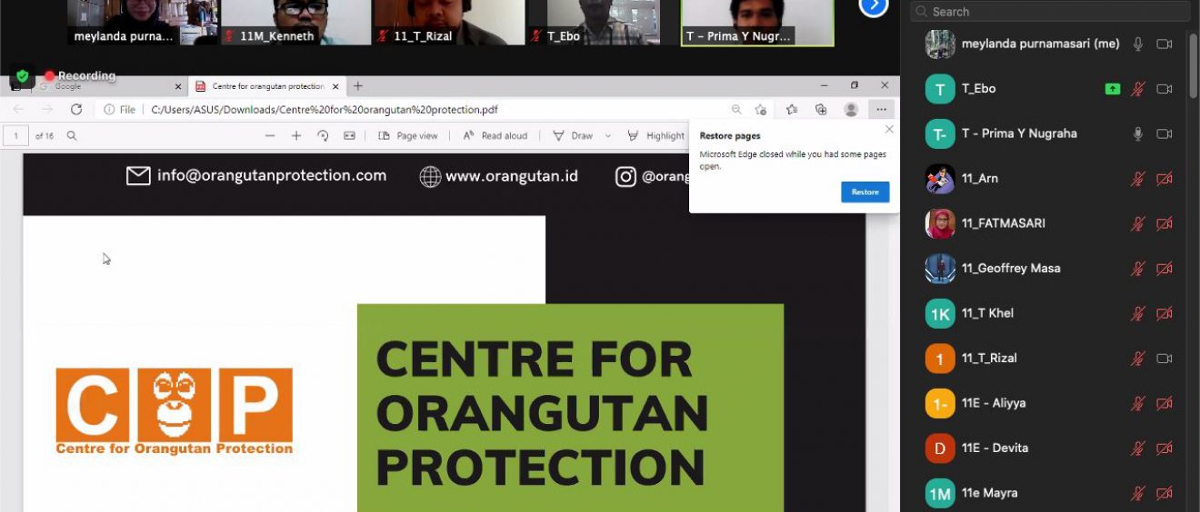 Perlindungan hutan dan konservasi orangutan menjadi materi Virtual Community Study Day pada Rabu,14 April 2021 yang diikuti 83 peserta yang berasal dari kelas 11 Mentari Intercultural School Bintaro. Kegiatan kunjungan sekolah yang sering dilakukan Orangufriends (kelompok pendukung COP) sebagai bagian dari kegiatan edukasi hanya dapat terlaksana beberapa kali dan itu pun secara virtual. Pandemi COVID-19 banyak mengubah cara dan kebiasaan kita, salah satunya kunjungan ke sekolah. Sekolah sendiri juga kesulitan melaksanakan proses belajar-mengajar secara virtual karena keterbatasan peralatan maupun kemampuan internet.